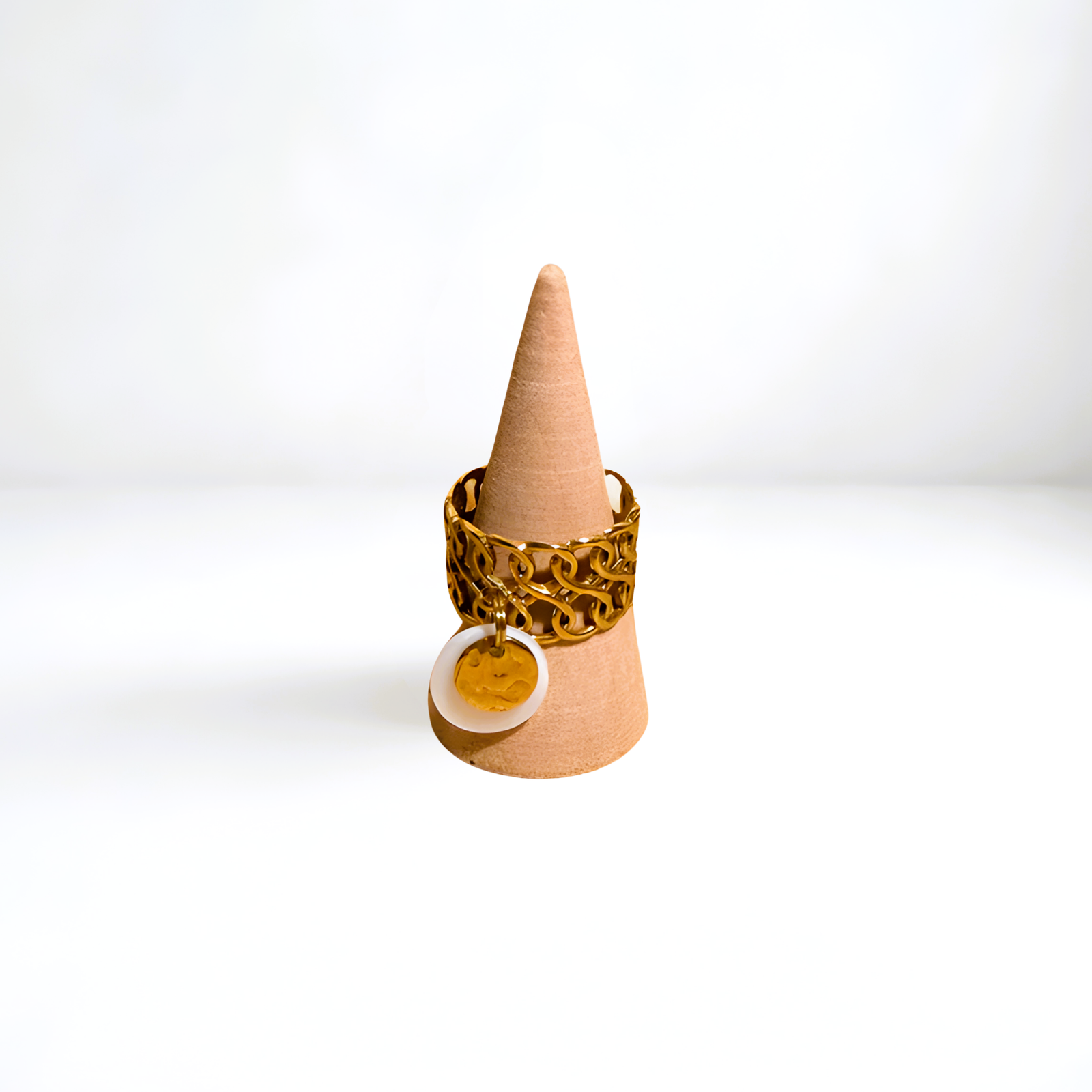 Bague Maria en acier inoxydable doré, fait main. Élégante, durable et lumineuse, avec option de pendentif personnalisable. Parfaite pour un usage quotidien ou comme cadeau raffiné.